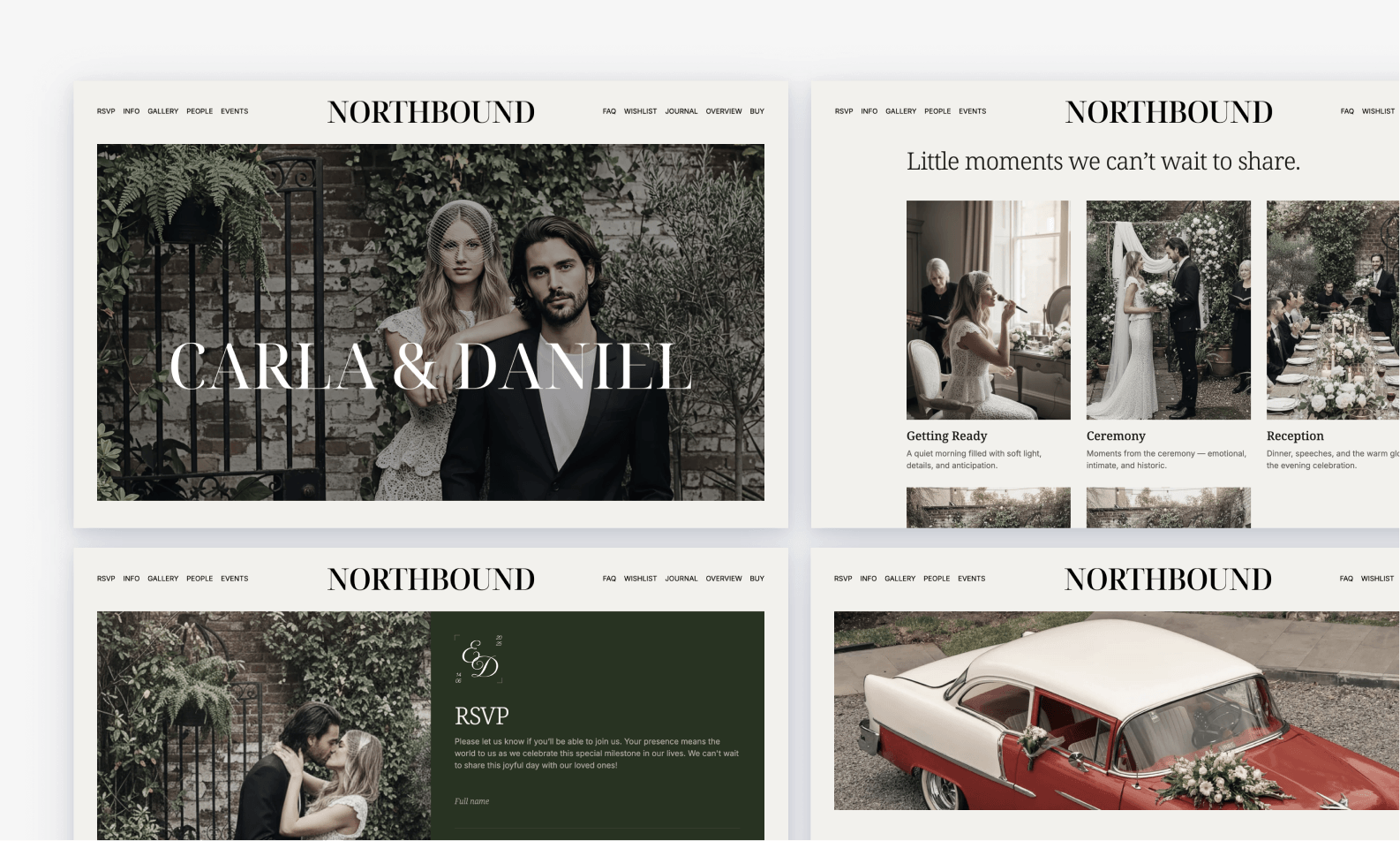 Northbound is a polished, image-led wedding website template built with Astro and Tailwind CSS. With serene typography, harmonious layouts, and a narrative-driven feel, it gives couples a classic, enduring space to present their day.