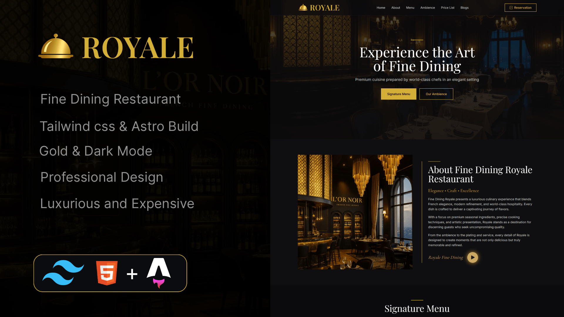 Royale is a Restaurant Astro Website Template, luxury-first website template crafted exclusively for fine dining restaurants and elite private dining establishments. From the first scroll to the final reservation — every pixel exudes sophistication, elegance, and opulence.