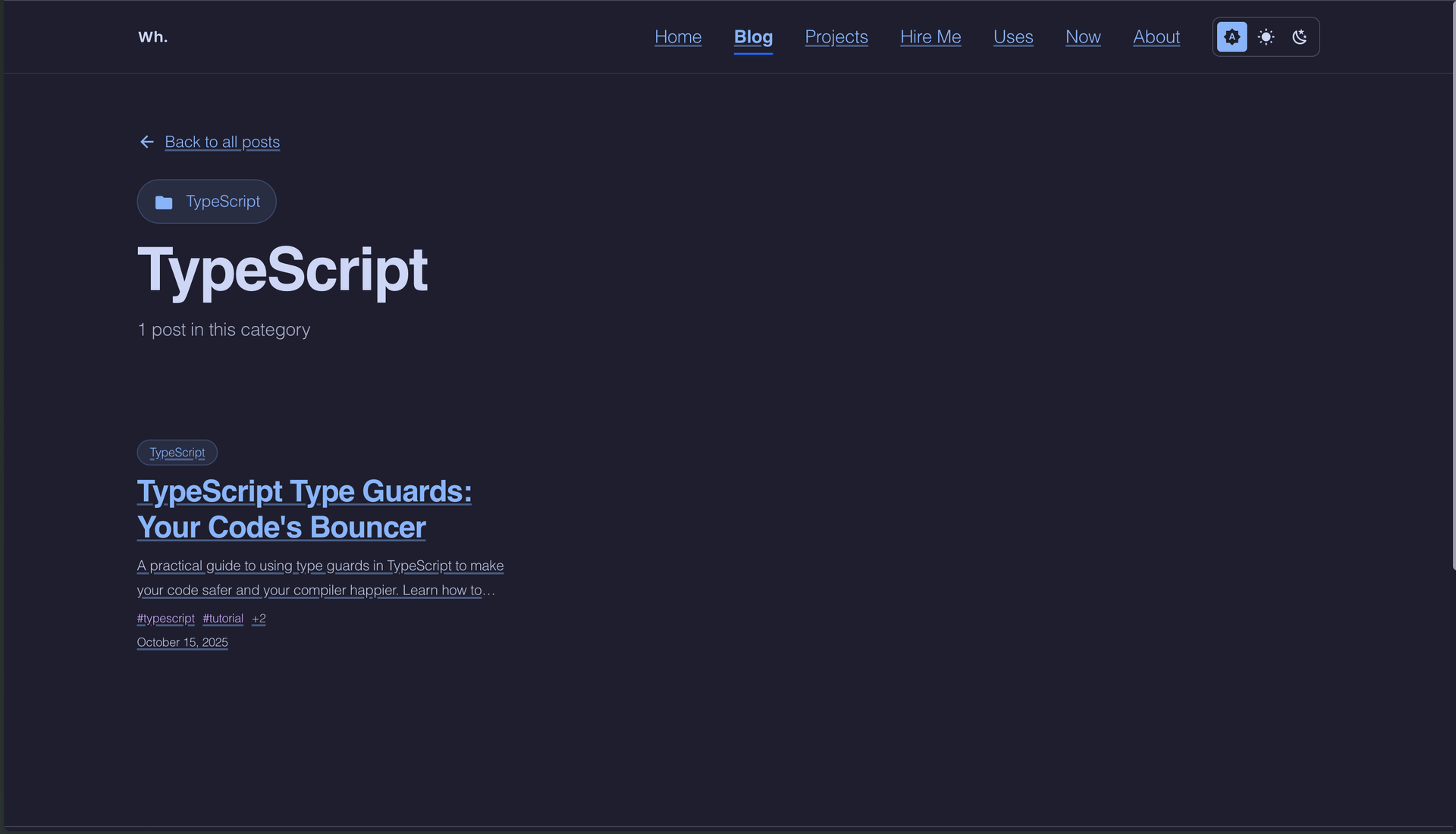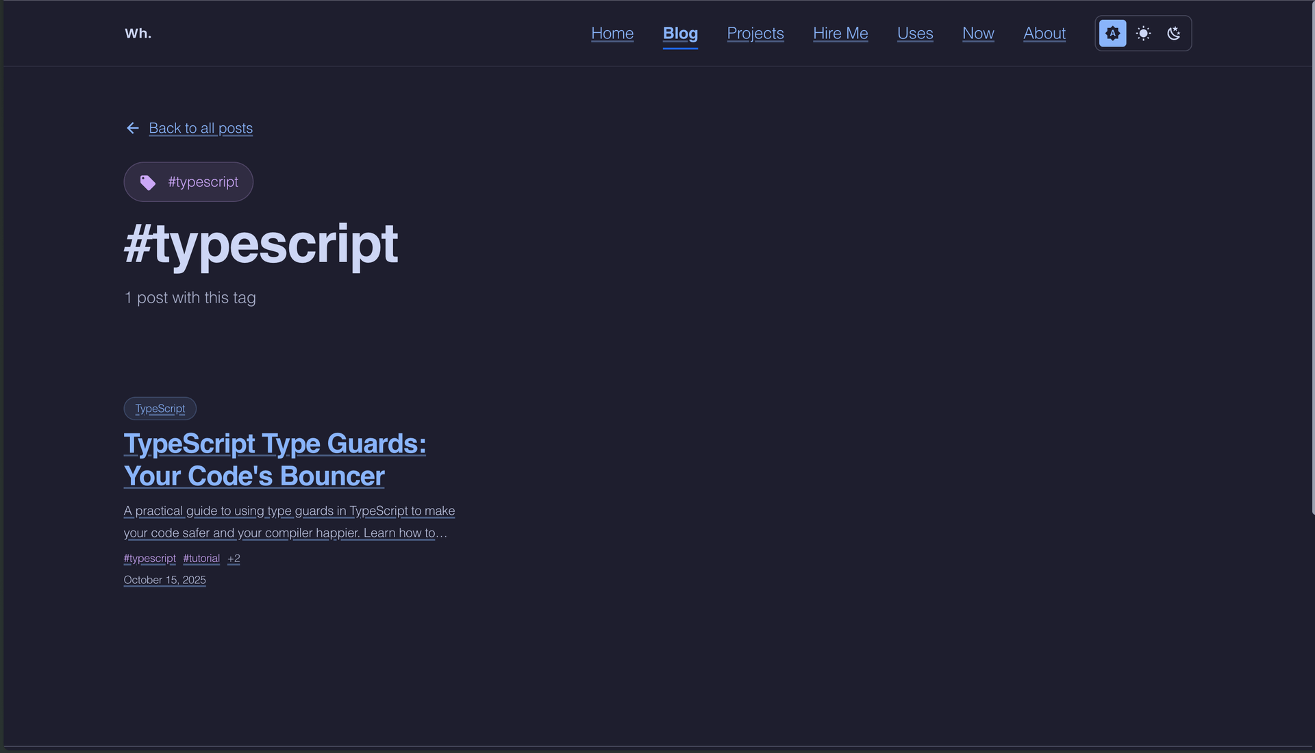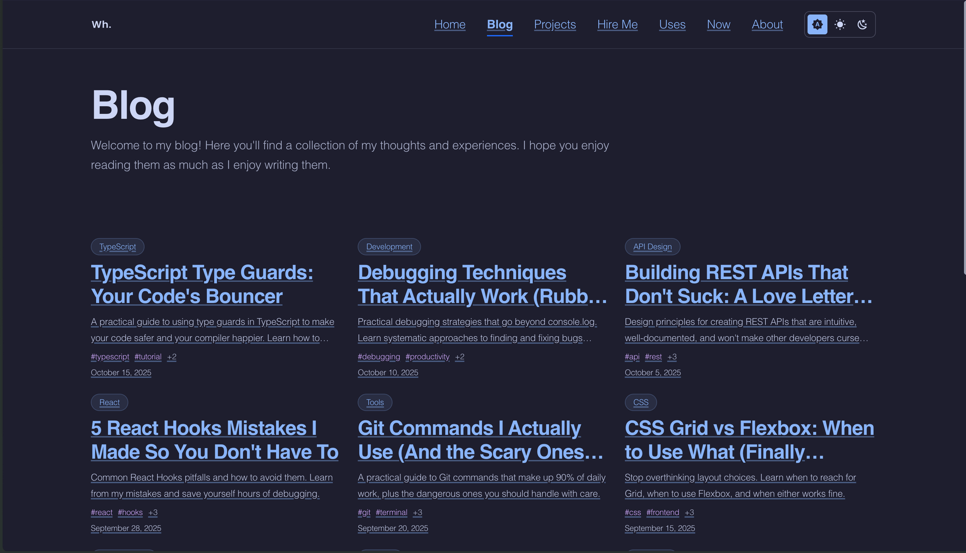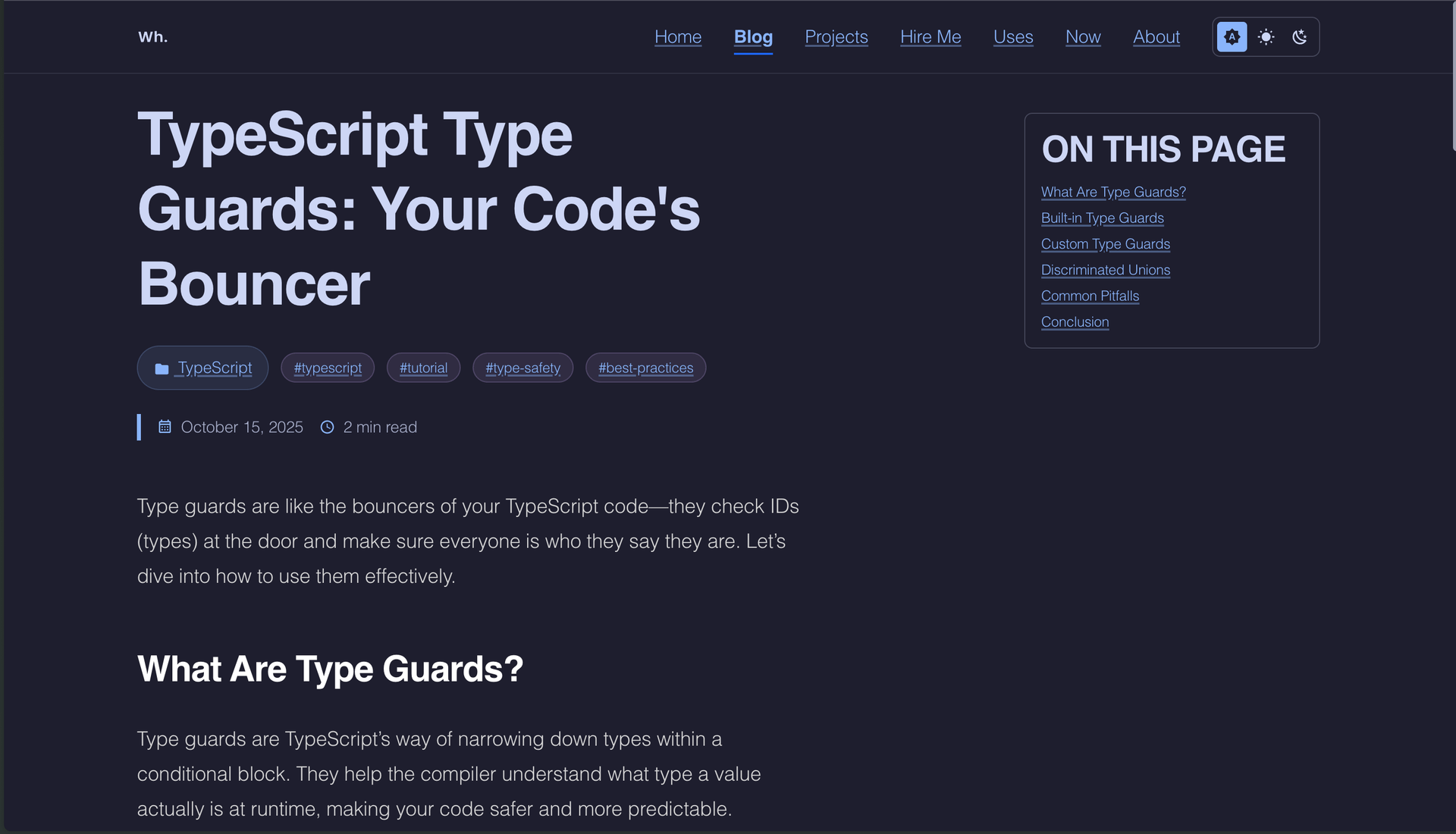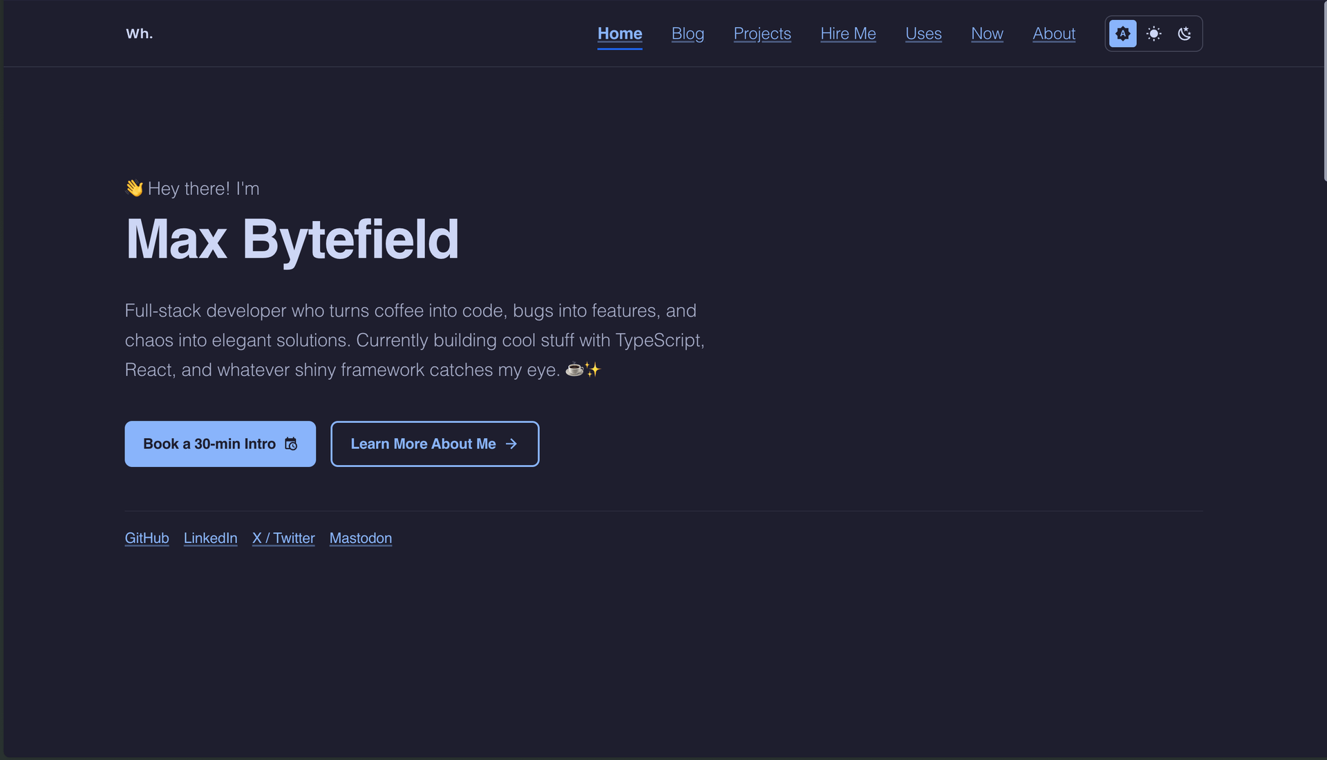 Whisper is a clean, fast Astro theme focused on readability and accessibility, using the Catppuccin Latte/Mocha palettes with WCAG AA contrast and native dark mode. It ships responsive layouts, SEO‑ready meta/Open Graph, and a blog with reading time and table of contents. The repo includes a playful example persona, “Max Bytefield,” with home, about, now, uses, projects, and a quirky 404—ideal for showcasing a developer portfolio before you replace it.